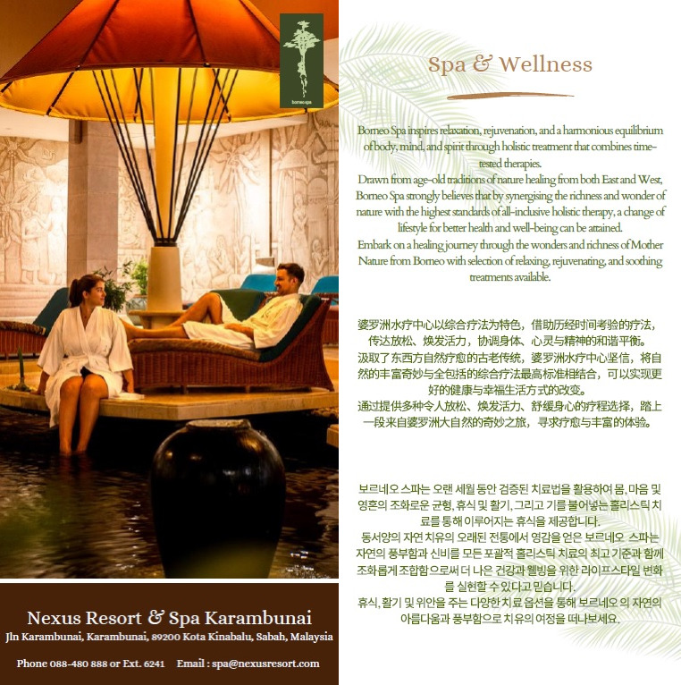 4 – Tue | 4/22/25 | Nexus Resort and Spa Karambunai Address: Off Jalan Sepangar Bay, PO Box, 88993, Sabah, Malaysia | Check out from Owl’s Nest Suite by noon and transfer to Nexus Resort & Spa Relax by the Sea @ 3pm |